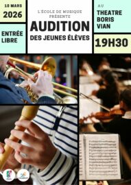 Nos jeunes élèves vont se produire sur la scène du Théâtre Boris Vian le mardi 10 mars à 19h30. Pour certain(e)s, ce sera la 1ère...