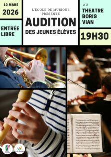 Nos jeunes élèves vont se produire sur la scène du Théâtre Boris Vian le mardi 10 mars à 19h30. Pour certain(e)s, ce sera la 1ère fois, remplissons la salle pour fêter cela!